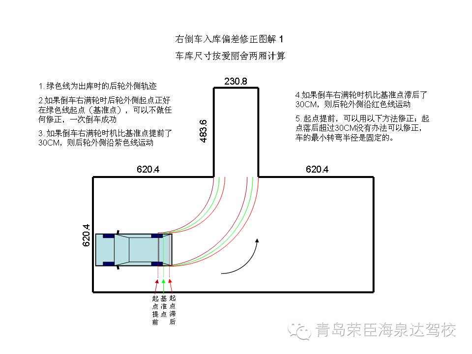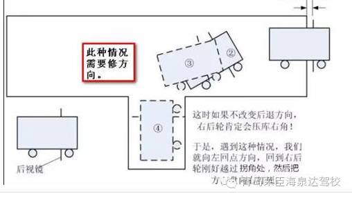 方法:右倒库时,如果目测车身与库角距离不是很准,回第一圈后发现离库角距离过宽,再向右打一圈继续退看车身与库线平行,马上向左两圈回正方向。看左镜压库前边线时停车。其实调整车距与库线距离的诀窍就是,你想让车往哪边库线离得近一点,你的方向盘就要往哪个方向转,反之亦然。例如下图所示: